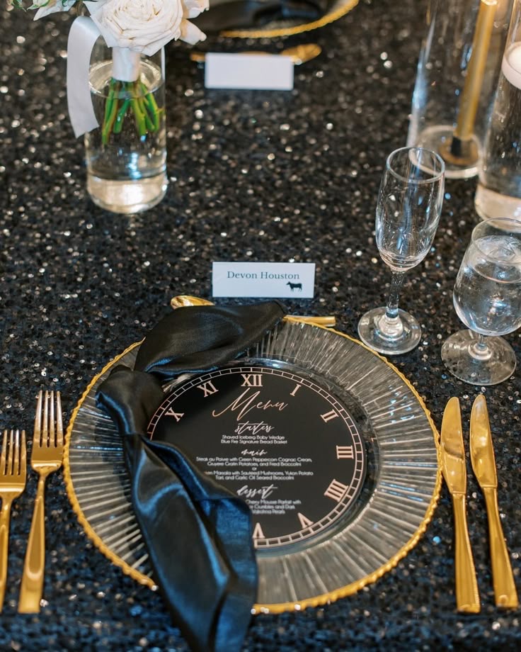 Incorporate the excitement of the midnight countdown into your table decor with clock-themed charger plates set against black sequin tablecloths. Accents like gold flatware and satin napkins enhance the sophisticated vibe, making each place setting feel part of the celebration. Extending the clock motif to your seating chart or table numbers adds a playful yet elegant touch that guests will appreciate.