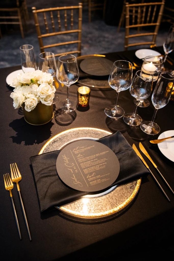 This design embraces a sleek, minimalist aesthetic while maintaining a luxurious feel. Matte black napkins layered on shimmering gold chargers create a striking contrast, softened by white roses in golden vases. Gold flatware and candlelight unify the palette, offering a warm and inviting atmosphere. This modern approach pairs beautifully with chic black gowns and metallic accessories, perfect for couples seeking timeless style with a contemporary edge.