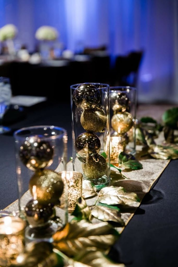 For a budget-friendly yet eye-catching centerpiece, glass cylinders filled with glittering gold ornaments offer a festive and chic option. Accented with votive candles and metallic leaves, this arrangement adds holiday cheer without overwhelming the table. Repurposing holiday decorations in this way brings a fresh twist to your wedding decor, with candlelight enhancing the sparkle for a romantic glow.
