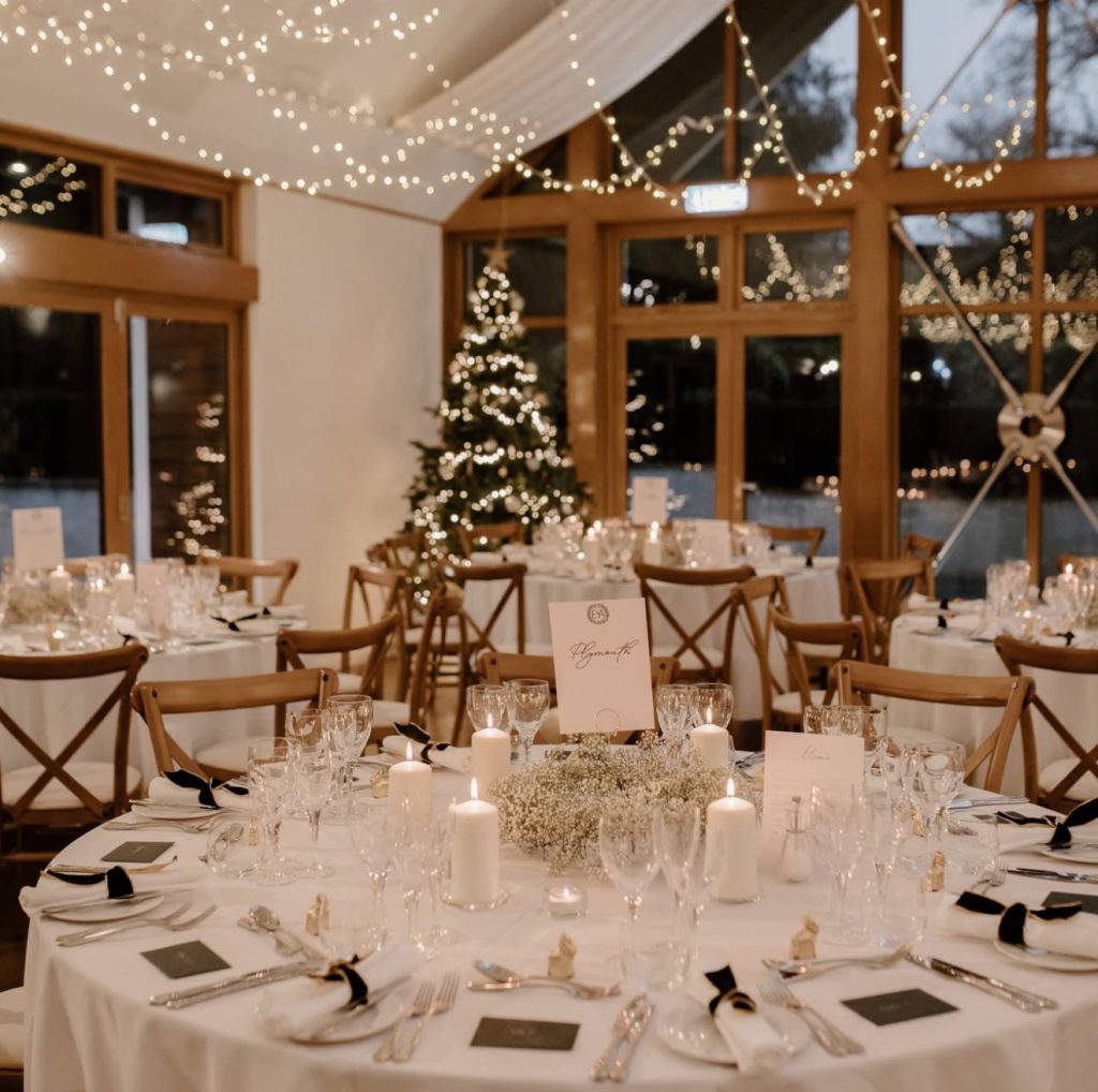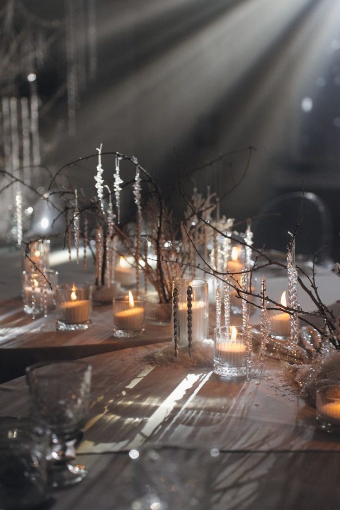 Embrace the chill with icicle-inspired decorations, branches, and glowing candles that create a silvery, frosted effect. This romantic and seasonal design is perfect for couples wanting their New Year’s Eve wedding to evoke a true winter wonderland. Coordinating invitations, bridesmaid dresses, and cake designs in white and silver ensures a harmonious and enchanting celebration.