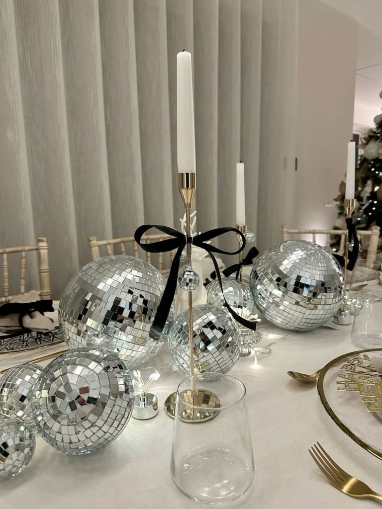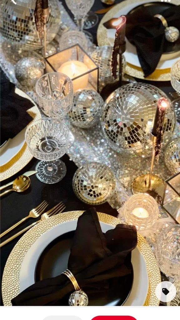 For a striking and glamorous effect, combine black taper candles with gold disco balls. This modern pairing captures the festive spirit of New Year’s Eve while maintaining elegance. The interplay of dark and metallic tones complements guest attire featuring sequins, sleek suits, and statement jewelry. Mirrored accents amplify the drama, making the table decor truly sparkle as the evening progresses.