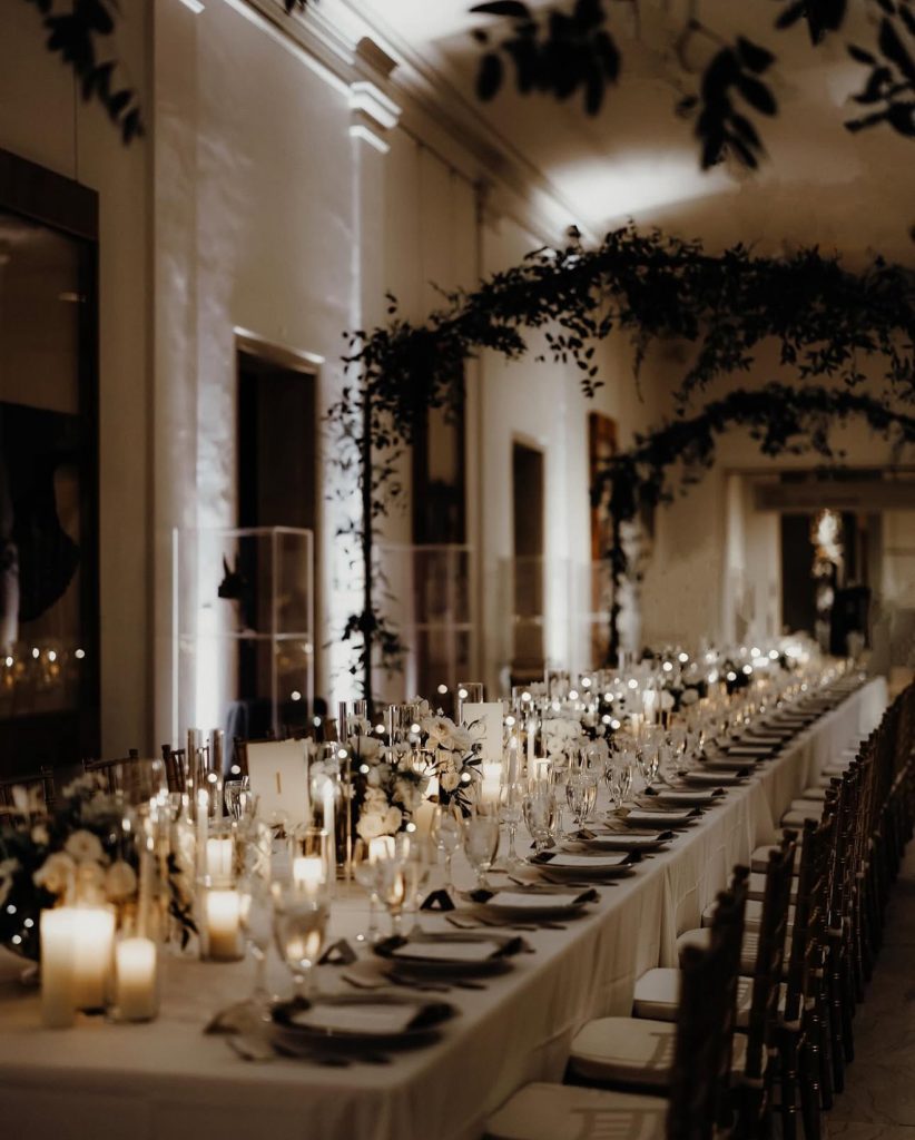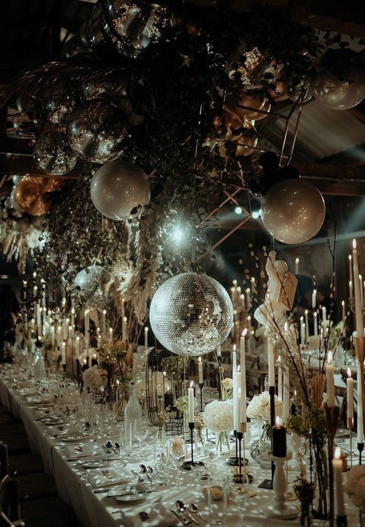 For a dramatic visual impact, consider overhead installations featuring greenery, pampas grass, and hanging disco balls. This blend of natural textures and metallic shine creates a unique and festive color palette. Flickering candlelight below adds depth and movement, enhancing the room’s ambiance. Guests dressed in flowing gowns and sleek tuxedos will perfectly complement this bold and elegant setting.