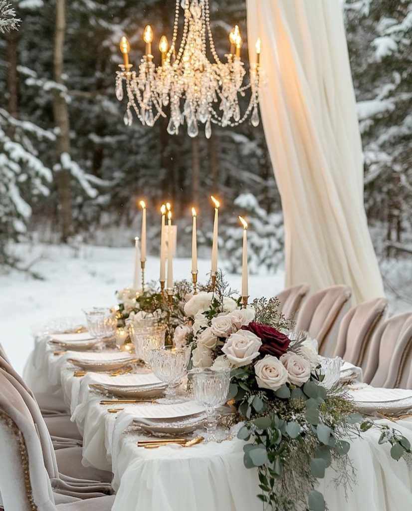 For couples embracing the chill of winter, a snowy outdoor wedding offers breathtaking beauty. Crystal chandeliers, cascading floral arrangements, and tall candle displays transform the space into a winter wonderland. Rich burgundy roses add festive warmth against the snowy backdrop. Coordinating invitations and bridesmaid dresses in complementary hues ensures a seamless aesthetic from ceremony to reception.