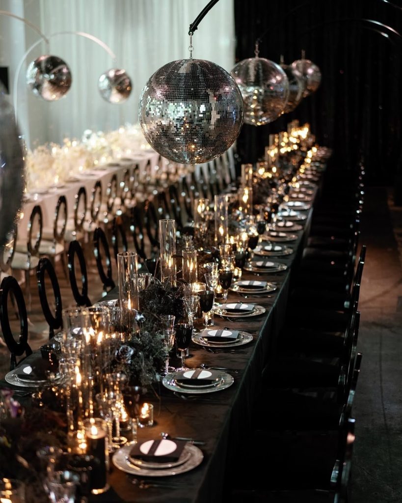 Transform your reception into a chic nightclub experience with rows of suspended disco balls, black linens, metallic chargers, and glowing candles. This moody yet sophisticated decor encourages guests to embrace daring attire such as sequins, velvet, and metallic accessories. This theme demonstrates how a well-executed concept can create a memorable and stylish celebration.