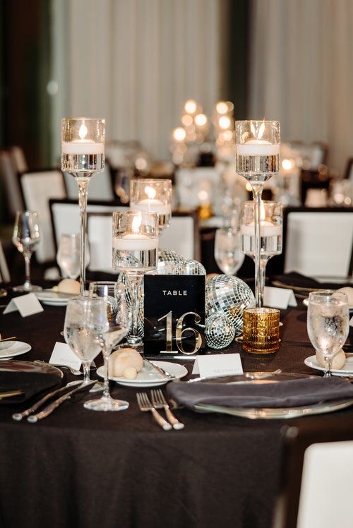 A minimalist yet impactful design featuring tall glass vases, floating candles, and clusters of disco balls creates a cohesive and elegant tablescape. The combination of clear glass, gold accents, and reflective elements balances style and order. Numbered seating charts integrated into the design maintain organization while enhancing the festive atmosphere, ideal for couples seeking understated sophistication.