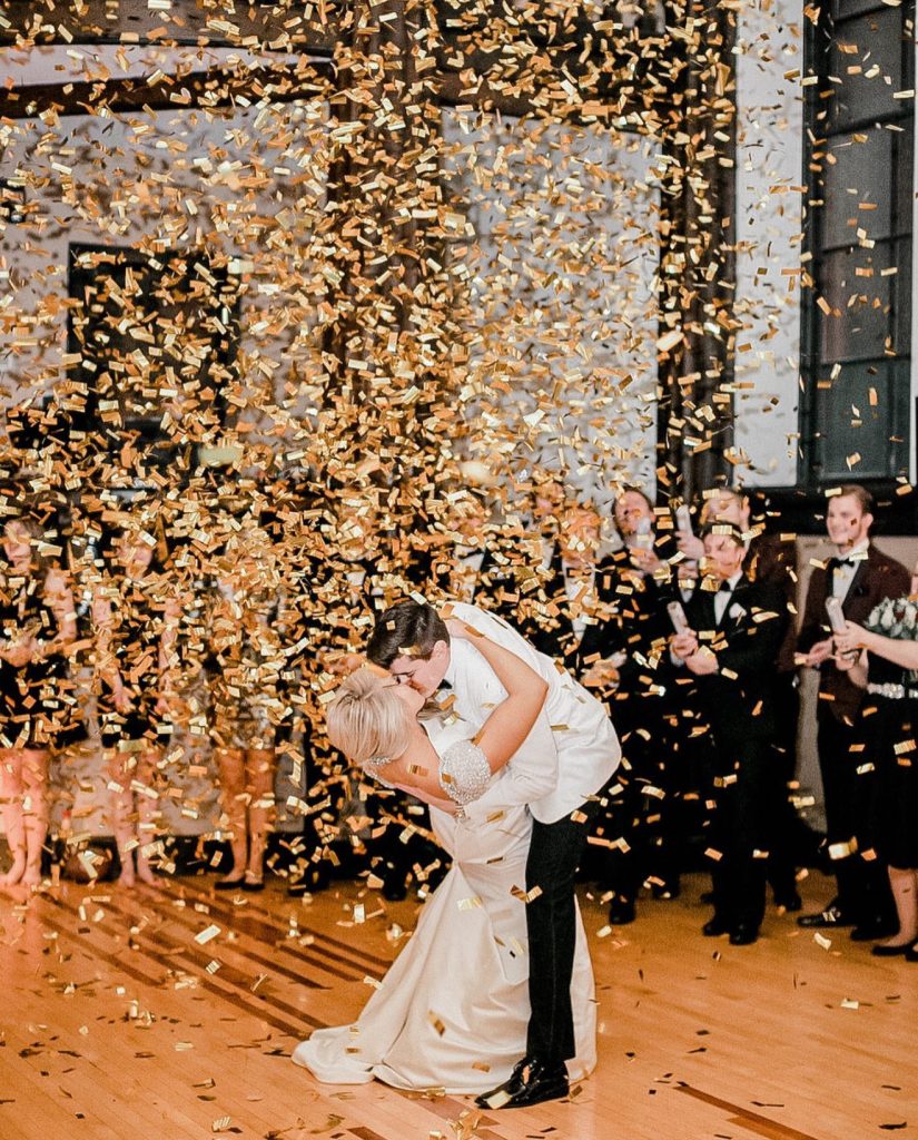 Few moments rival the enchantment of exchanging vows followed by a kiss as confetti showers the celebration. This elegant scene embodies the spirit of a black-tie affair, where sophistication meets exuberance. The bride’s satin dress perfectly balances classic romance with festive shimmer. Guests are encouraged to don chic cocktail dresses or formal suits, elevating the evening’s tone. Incorporating glitter cannons or confetti bursts at the stroke of midnight adds a spectacular flourish, ensuring your wedding is remembered as the season’s most dazzling event.
