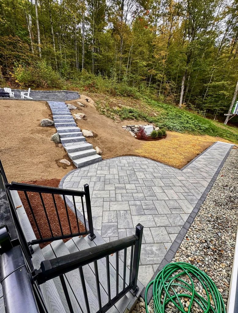 For properties with uneven terrain, this hillside patio offers a harmonious blend of functionality and visual appeal. Broad stone steps descend gracefully from an upper deck to a generous paver landing, facilitating smooth transitions between levels while preserving the natural landscape. The structured patio contrasts elegantly with the surrounding earth and greenery, creating a balanced and intentional outdoor space. This design is especially effective for integrating garden paths or walkways that connect different yard zones, with durable stone pavers ensuring longevity and minimal upkeep.