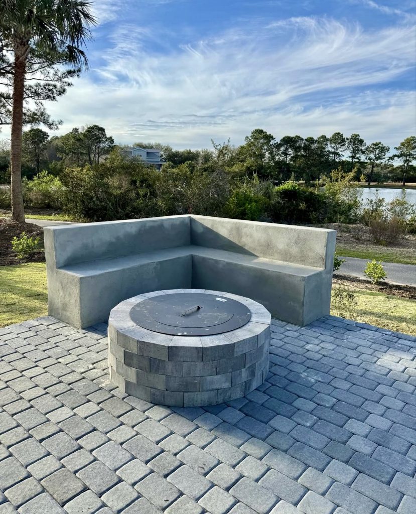 At the heart of this design lies a circular fire pit, ideal for cozy evening get-togethers and chilly nights outdoors. The rounded form softens the structured stone paver base, while the built-in corner bench offers a snug seating area that exudes luxury without overspending. Cobblestone-style pavers add texture and charm, demonstrating how smaller elements can create a striking visual impact when thoughtfully arranged. This layout naturally fosters conversation around the fire, making it a practical and stylish choice for versatile outdoor living spaces.