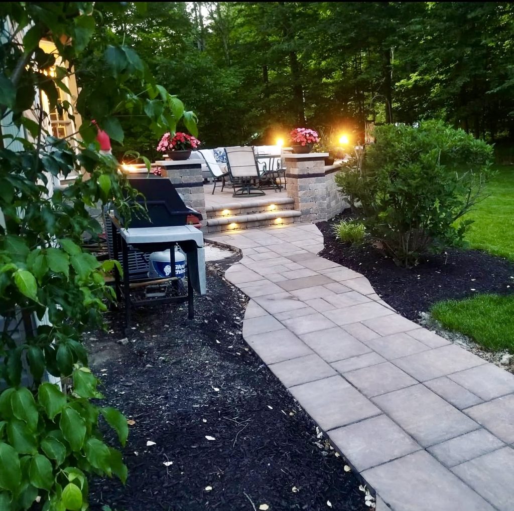 Soft lighting transforms this cozy patio into a serene evening haven, illustrating how simple upgrades can dramatically enhance a space’s ambiance. A gently curved concrete paver walkway adds character and guides movement, ideal for smaller yards where flow is essential. Earth-toned brick and stone steps and pillars create a classic yet inviting raised patio, with built-in step lights offering a budget-friendly custom touch. This space is perfect for intimate dinners or relaxing after a long day.