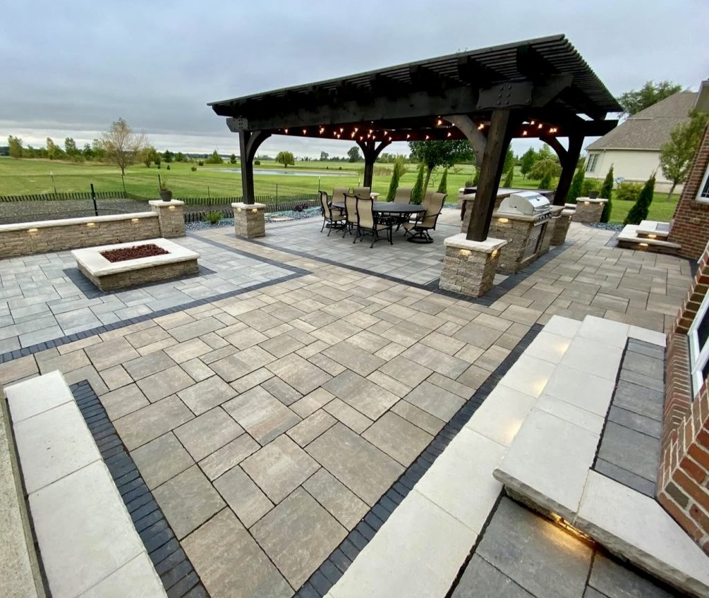 This thoughtfully arranged patio features distinct zones, with a built-in grill and counter space framed by a wooden pergola that adds structure without heaviness. The interplay of light and dark stone pavers creates layered areas that separate cooking, dining, and lounging spaces—an approach favored for large backyard projects. The cohesive design adds depth and sophistication, perfect for homeowners who enjoy entertaining but want a practical, low-maintenance setup. It’s a smart way to transform a simple concrete slab into a multifunctional outdoor haven.