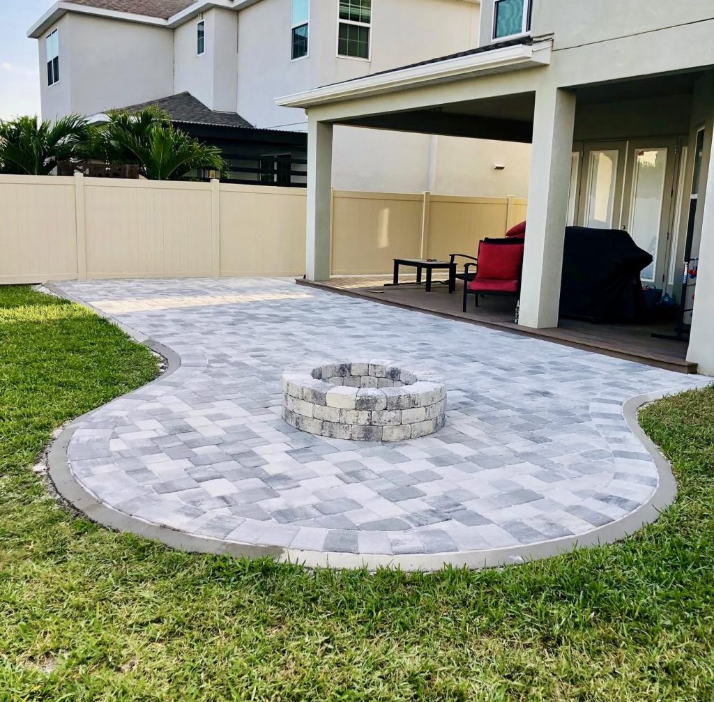 Soft hues and organic curves define this welcoming patio, ideal for families seeking a low-maintenance yet inviting outdoor surface. The rounded edges break from traditional rectangular layouts, showing that budget-friendly free-form designs are achievable with careful planning. A central fire pit serves as a natural gathering spot for year-round enjoyment. The combination of smooth pavers and a grassy border complements homes favoring relaxed outdoor living, especially in transitional spaces near decks or porches.