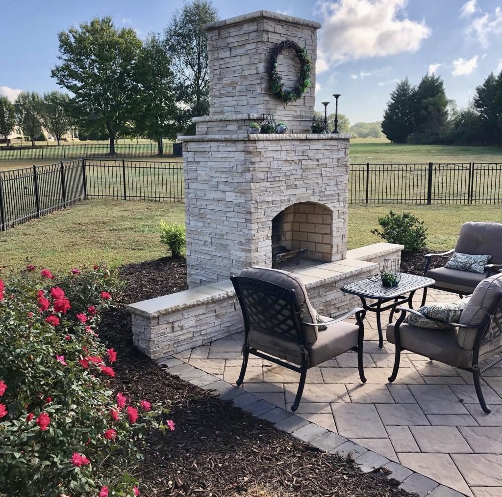 This charming patio features a built-in stone fireplace that elevates the outdoor space into a year-round gathering spot. The subtle herringbone paver pattern adds texture without overwhelming the serene setting, while the soft seating arrangement encourages long, comfortable evenings by the fire. A raised wall behind the chairs doubles as extra seating, a clever budget-friendly solution for multifunctional use. The warm tones and structured geometry create a timeless look suitable for both suburban and rural backyards.