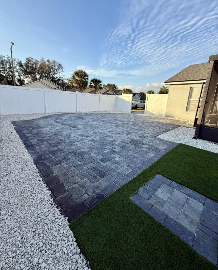 Dark Paver Patio with Gravel Borders and Turf Accents