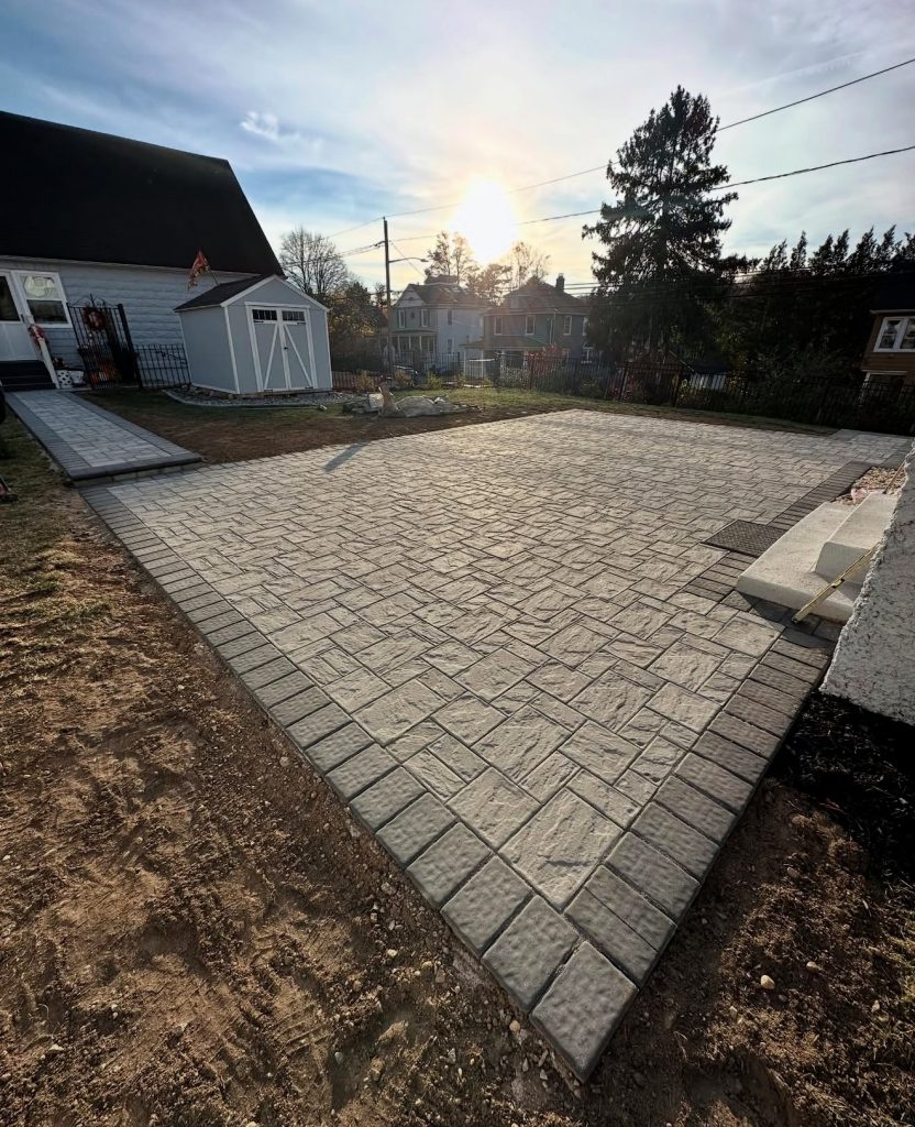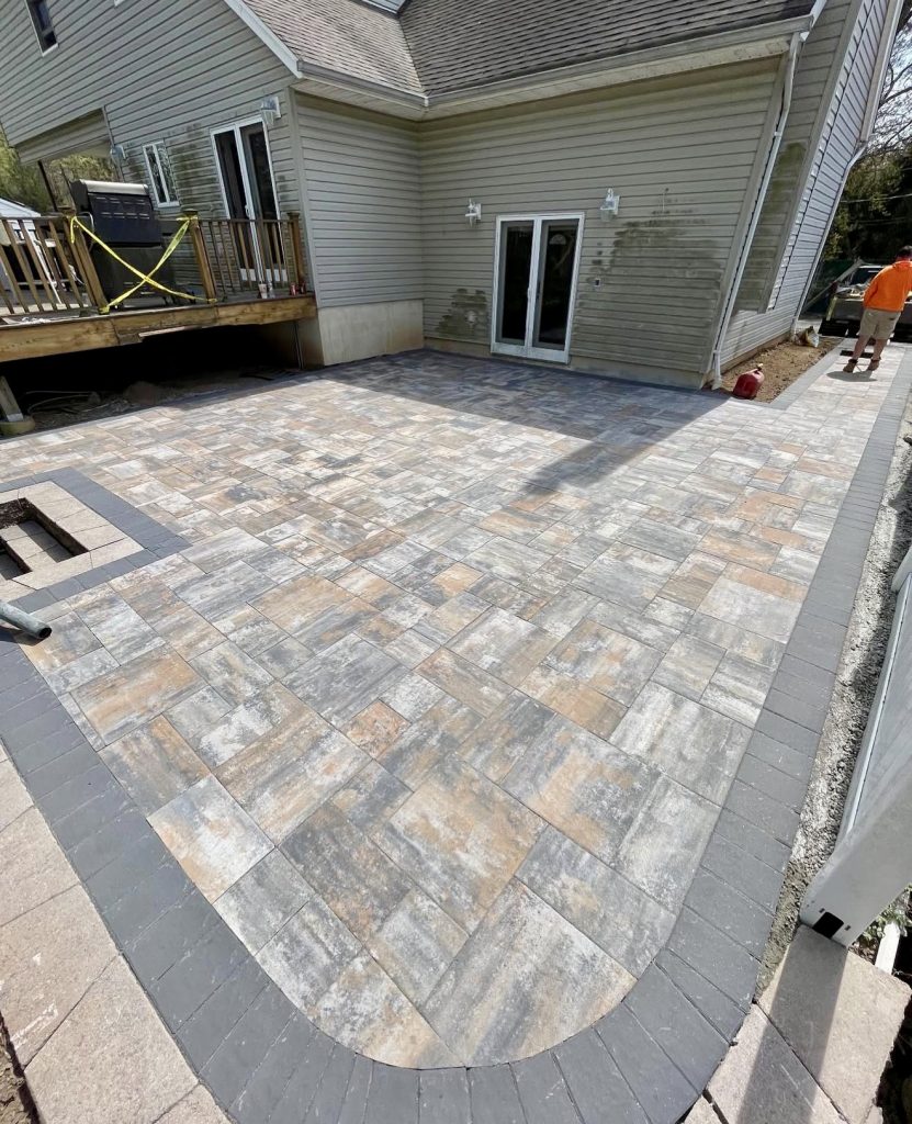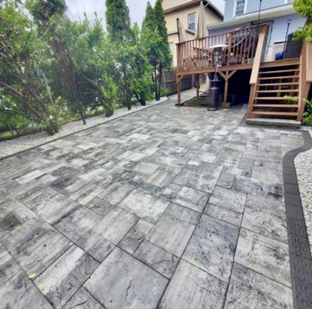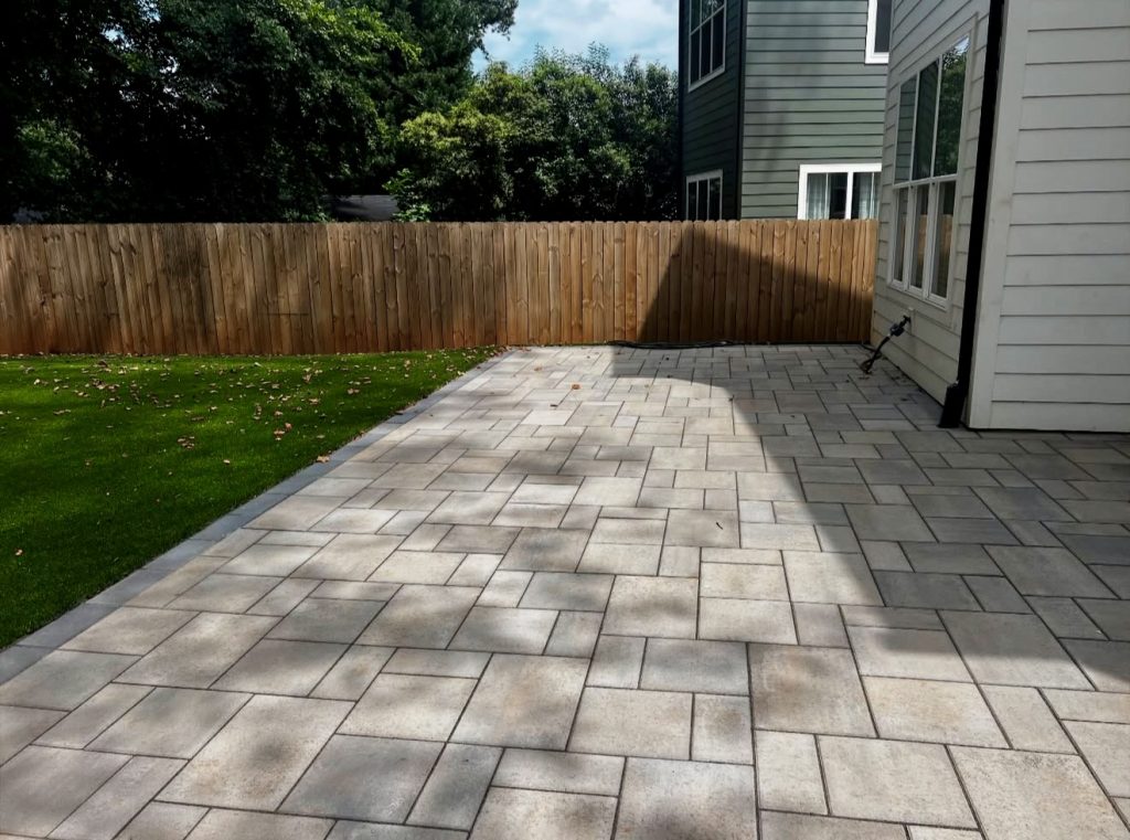 This expansive patio illustrates how a uniform paver pattern can exude elegance when applied on a grand scale, especially with sharp edging stones outlining the perimeter. Muted gray tones provide a neutral backdrop suitable for hosting, dining, or incorporating a built-in fire pit. For sloped or uneven yards, this cohesive layout visually levels the space and enhances usability. It’s a straightforward yet highly practical design ideal for suburban properties seeking a clean, budget-friendly outdoor area.
