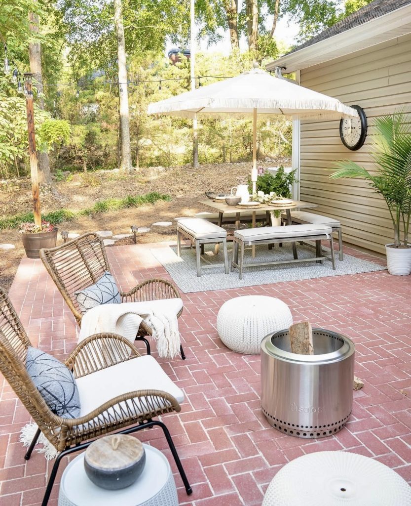 This inviting patio demonstrates how traditional brick can feel fresh when paired with light, modern furnishings and soft textures. The herringbone pattern adds timeless elegance, while a compact stainless steel fire pit offers functionality without overpowering the design—perfect for small yards or relaxed outdoor spaces. Stepping stones transition naturally into a wooded backdrop, exemplifying how thoughtful styling can transform a simple budget-friendly patio into a serene retreat. It’s a space designed for leisurely mornings, casual dinners, and year-round enjoyment.