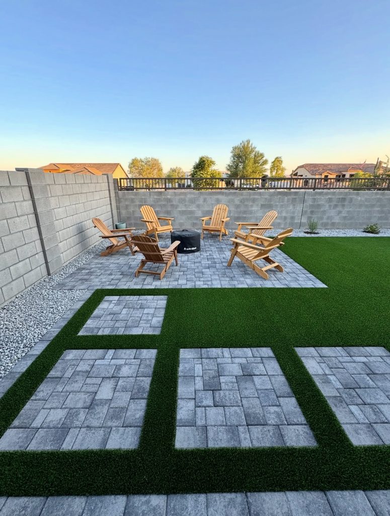 This crisp, modern patio incorporates geometric turf inlays to break up the expanse of gray concrete pavers, creating a dynamic and playful layout. A compact seating area built from smaller pavers forms a cozy conversation nook around a modest fire pit, ideal for small yards where space is limited but clearly defined zones are desired. Surrounding rock and gravel borders minimize maintenance and evoke a contemporary desert-inspired aesthetic. This design exemplifies how pairing artificial turf with pavers can yield a low-maintenance, visually engaging backyard on a budget.