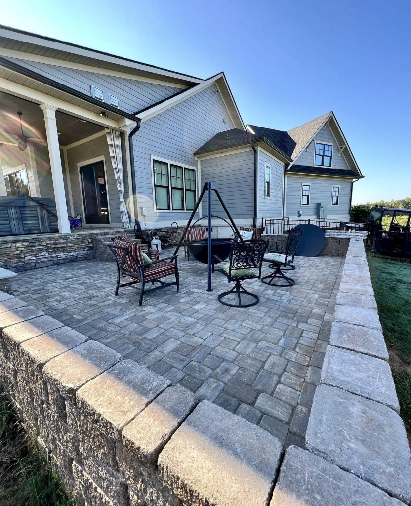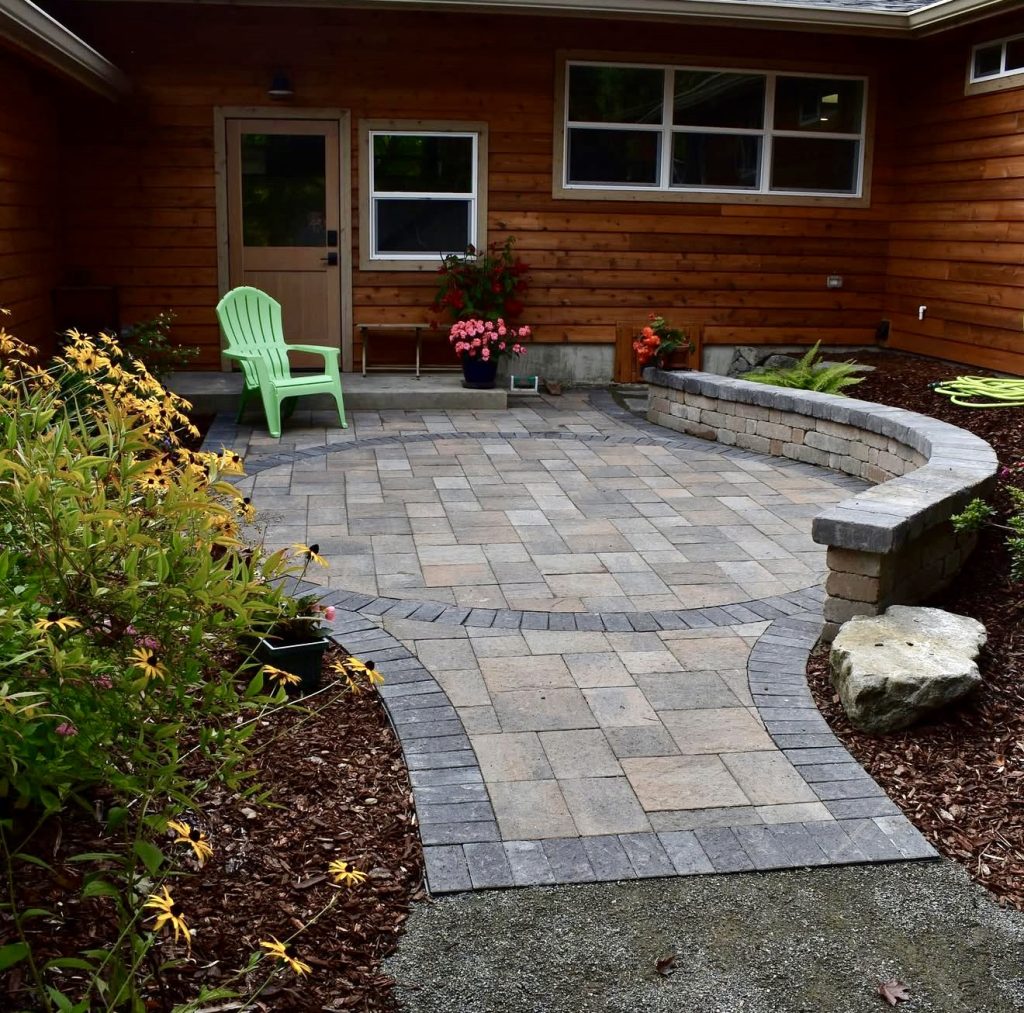 This charming patio embraces warm, earth-toned stone pavers framed by dark edging that guides the eye through its curved layout. A connecting walkway flows naturally into the main seating area, making it ideal for homes with cottage-style gardens or lush planting beds. The curved retaining bench offers both structure and casual seating, perfect for relaxed evenings or morning coffee. It’s a beautiful example of creating a welcoming outdoor oasis on a budget, blending natural aesthetics with strong architectural form.