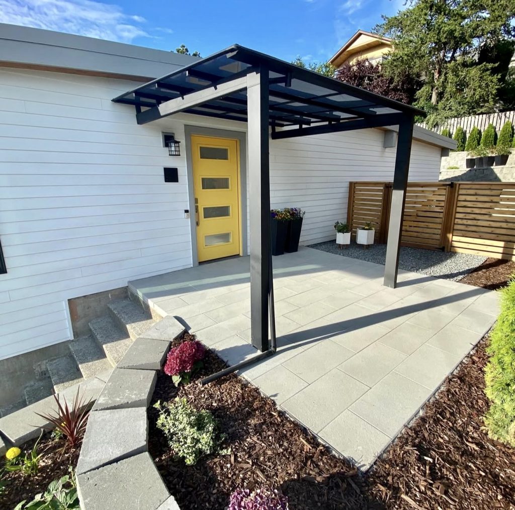 This modern front-entry patio features oversized concrete pavers arranged in a linear pattern that instantly enhances curb appeal. A dark steel pergola adds architectural interest while framing a bright yellow door, creating a striking focal point without requiring much space—ideal for narrow yards. A curved garden bed softens the hardscape, incorporating greenery, rocks, and mulch for a low-maintenance, budget-friendly design. This space proves that minimalism combined with warmth can transform even small patios into inviting outdoor extensions.