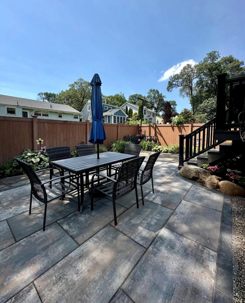 As dusk falls, this patio remains inviting thanks to carefully positioned lighting that accentuates both the garden beds and the geometric paver layout. Cool-toned stones reflect the evening sky, while illuminated mulch beds and evergreens add warmth and depth. This design suits homeowners seeking a visually captivating patio that feels welcoming day and night. It’s a testament to how simple lighting enhancements can transform modest backyards into elegant retreats on a budget.