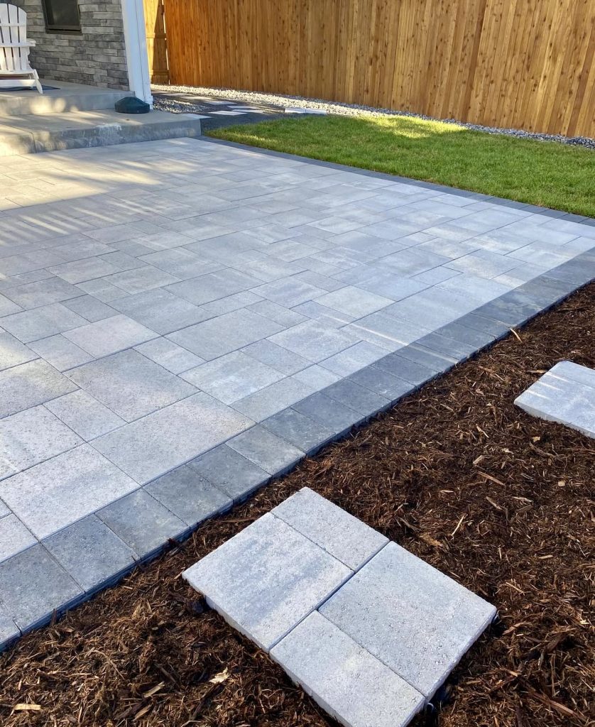 This sleek patio design employs a combination of light and medium gray concrete pavers arranged in a precise, geometric pattern that instantly uplifts the backyard’s aesthetic. A darker border frames the space subtly, providing definition without detracting from the minimalist vibe—an excellent strategy for budget-conscious homeowners seeking a refined finish. The seamless transition into mulch and stepping stones encourages natural pathways for gardens or future walkways. The balanced paver arrangement mimics custom tile patterns, offering a high-end look without the hefty price tag. This setup is perfect for those desiring a low-maintenance yet sophisticated outdoor area.