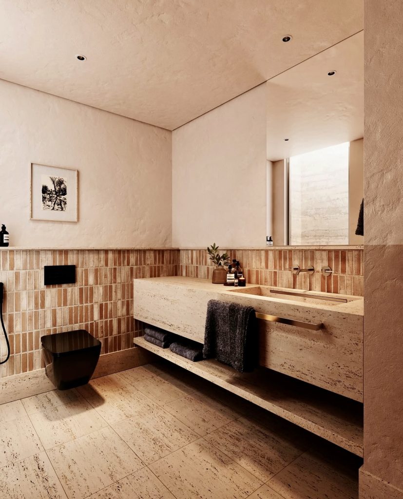 In this spacious half bath, dark, moody hues blend effortlessly with natural textures to create a spa-like retreat. Sand-colored walls and linear tiles evoke calm, while matte black fixtures and a floating vanity add sleek architectural interest. The open floor space enhances the room’s airy feel, making it ideal for compact or basement layouts seeking a serene, sculptural atmosphere. This approach aligns with the growing trend of “quiet luxury” in small spaces, emphasizing tactile materials and understated elegance.
