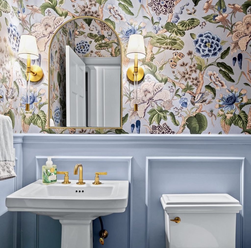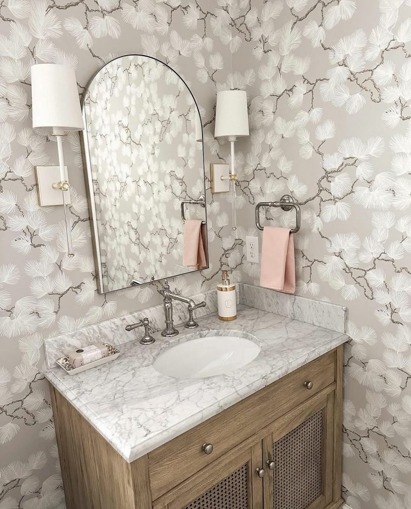 This charming half bath celebrates softness with pale botanical wallpaper that adds gentle movement to the walls. Light pink accents infuse warmth and charm, while a wood vanity topped with marble grounds the space in upscale traditional style. Coordinated sconces and metallic finishes create a polished, cohesive look. This design exemplifies how even the smallest guest bathrooms can be transformed into unique, character-filled retreats.