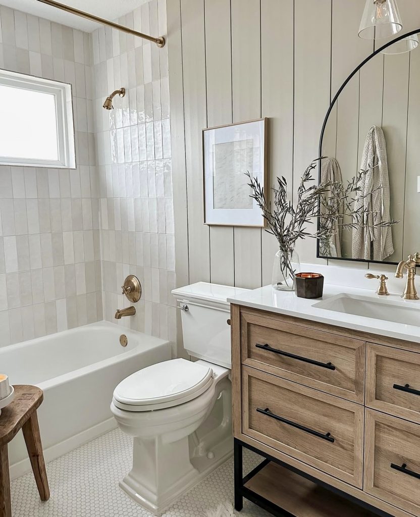 This half bath artfully combines rustic charm with modern simplicity. Featuring a wooden vanity adorned with brass hardware, it pairs seamlessly with soft neutral tiles and vertical paneling that enhance the room’s inviting atmosphere. This blend evokes farmhouse or coastal vibes, creating a space that feels both timeless and approachable. Incorporating natural elements like plants or branches aligns with the growing biophilic design trend, fostering a connection to nature within small guest bathrooms.