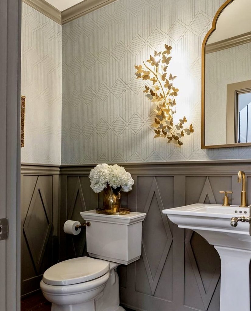 This dramatic half bath embraces bold geometry and a moody color scheme to create a striking visual impact. The textured wall paneling adds depth, while a gilded leaf wall sconce transforms lighting into an artistic feature. A pedestal sink paired with black-accented fixtures elevates the space with modern luxury. This style, popular among designers, combines matte finishes with gold accents to deliver a high-end look that remains accessible for budget-conscious homeowners seeking a distinctive powder room.