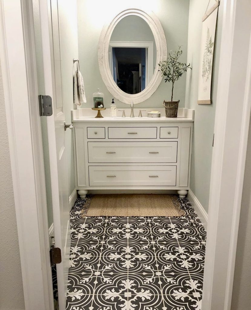 This compact half bath exudes tranquility with its gentle sage walls and ornamental patterned tiles that serve as a lively focal point. The white vanity reflects a bright, coastal energy, while an oval decorative mirror balances the composition. Accents like a small potted plant and woven rug enhance the serene ambiance, blending vintage charm with modern updates. This design is ideal for those seeking a guest bathroom that feels both nostalgic and refreshed.