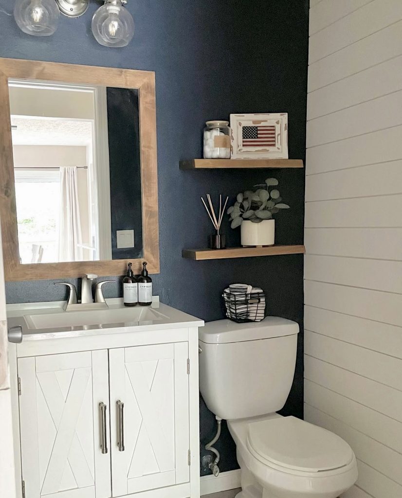 Combining deep, moody hues with rustic farmhouse elements, this half bath features a rich navy wall that adds depth and drama. Shiplap paneling and a wood-framed mirror introduce natural warmth, while a crisp white vanity and pedestal sink provide contrast and timeless appeal. Open wood shelving offers renter-friendly storage and display options, making this design practical for apartments. This bold approach demonstrates how dark colors can make small spaces feel stylish rather than confined.