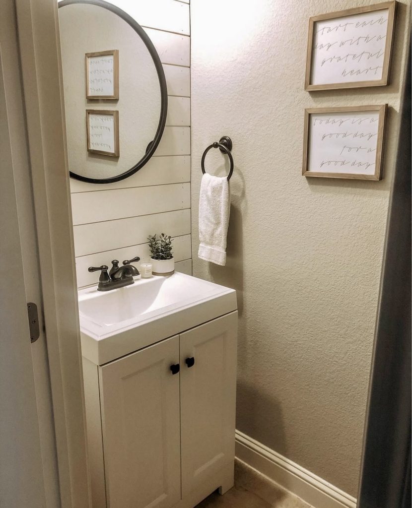 This slender half bath highlights the timeless appeal of neutral shades. Featuring a streamlined vanity, round mirror, and white shiplap walls, it creates a cozy farmhouse vibe that’s both renter-friendly and budget-conscious. Black accents add modern structure, while subtle wall art injects personality without overwhelming the space. This minimalist design proves that even the smallest bathrooms can feel thoughtfully curated and inviting.