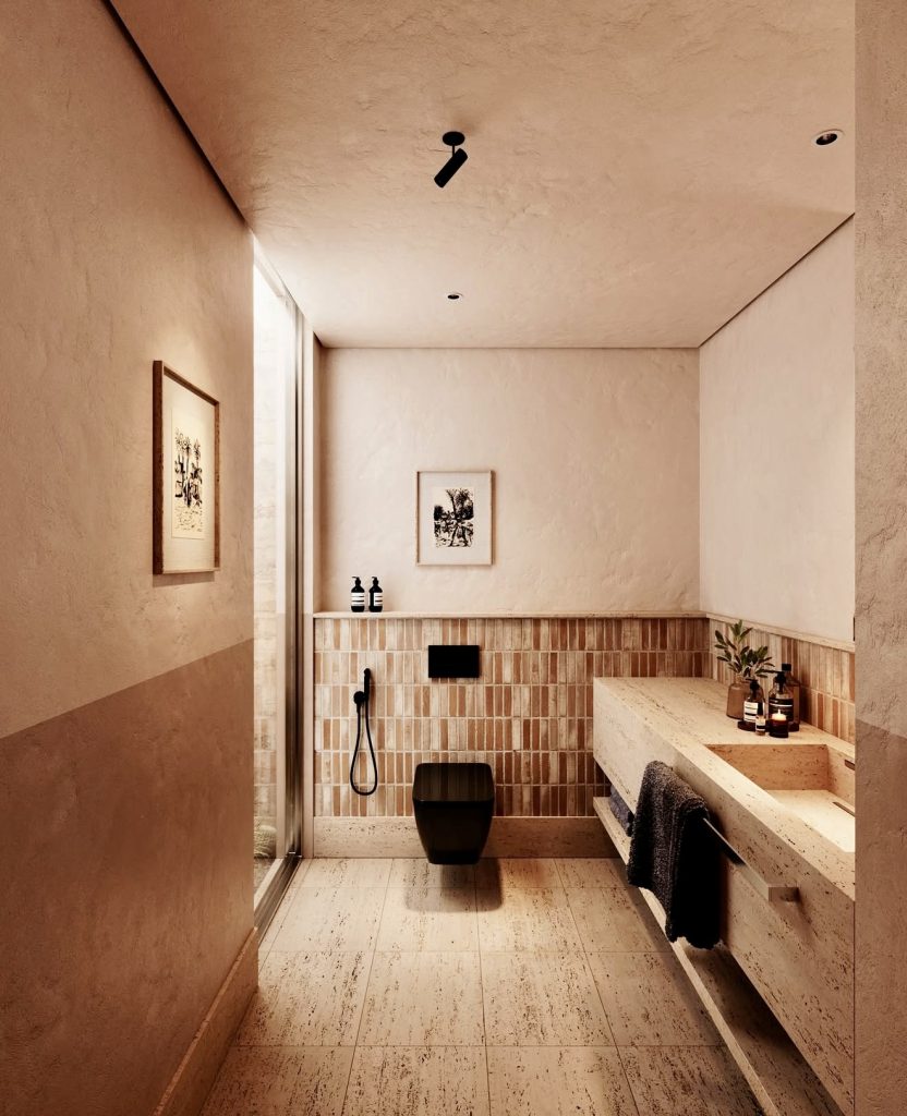 Modern powder rooms are increasingly embracing deep, moody palettes that evoke calm and sophistication. This design layers natural stone textures in warm beige and clay hues, creating an earthy, neutral backdrop. A floating vanity with an integrated sink offers a renter-friendly solution with concealed storage, while a sleek black toilet adds a sculptural, avant-garde touch. Drawing inspiration from European spa aesthetics, this style thrives in compact or narrow spaces that desire elegance without clutter.