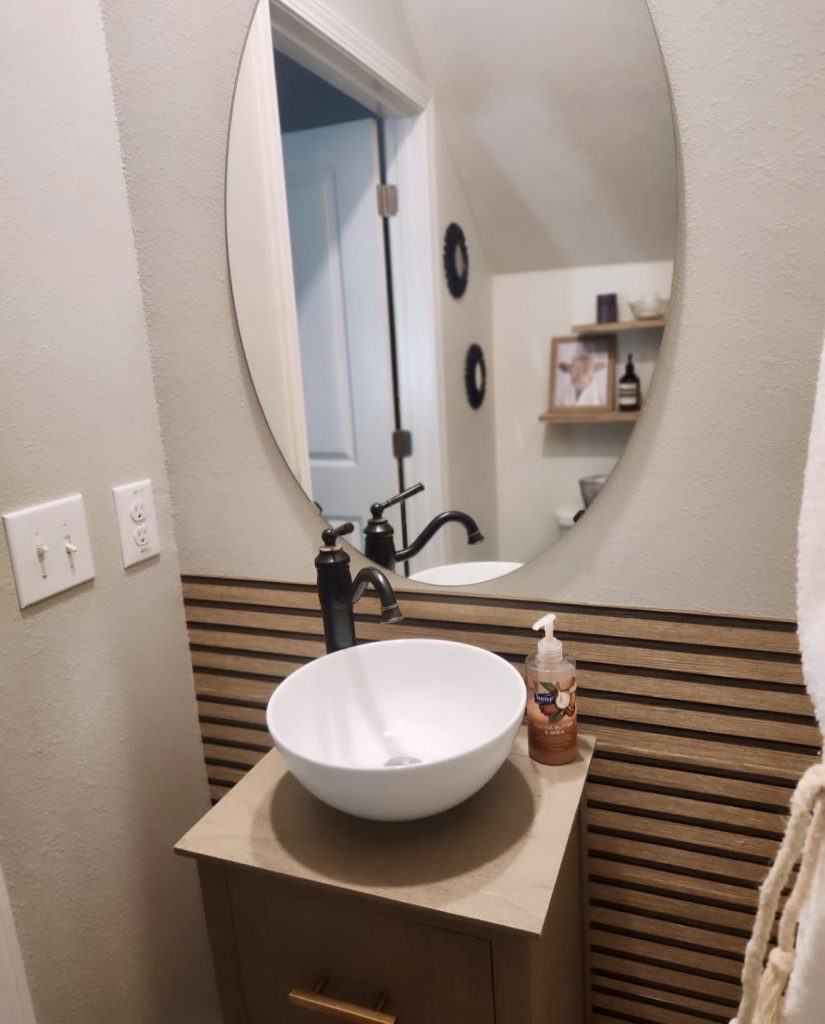 This design embraces simplicity with a warm, coastal vibe. A wooden vanity contrasts softly against a crisp white vessel sink, while a slatted backsplash adds subtle texture without overpowering the minimalist aesthetic. Black fixtures provide a contemporary accent, making this an easy, renter-friendly update that balances natural materials with sleek modernity. It’s a budget-conscious choice that brings effortless charm to small guest bathrooms.