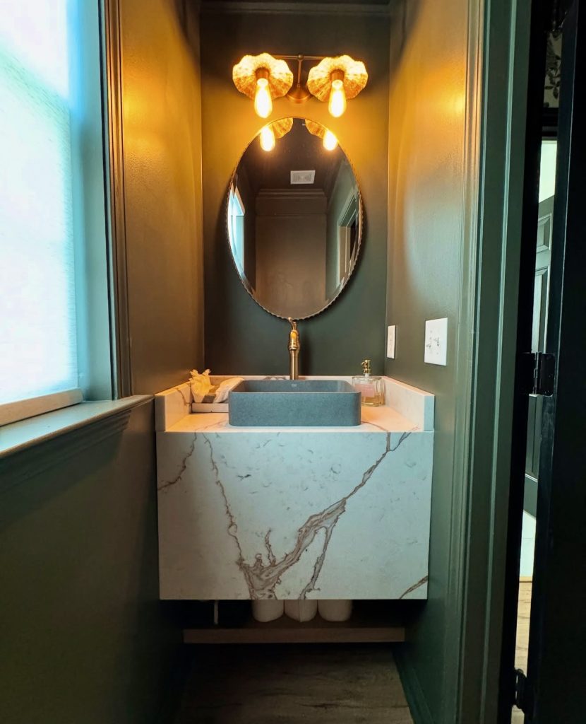 Embodying sophistication and confidence, this dark half bath features deep green walls that envelop the space in an intimate glow, perfect for evening ambiance. A marble floating vanity adds a sculptural, timeless element, while gold fixtures and vintage-inspired lighting introduce warmth and glamour. This design thrives in narrow layouts, proving that bold color choices can make small rooms feel intentionally dramatic and luxurious—ideal for apartment dwellers seeking modern elegance with personality.