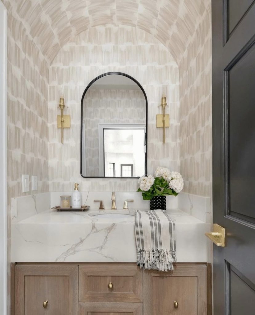 Featuring arched ceilings and marble surfaces, this half bath blends traditional elegance with contemporary freshness. A neutral color palette highlights architectural details, creating a space that feels both grand and welcoming. Black-framed mirrors and gold sconces introduce modern contrast, making this design versatile for farmhouse or urban apartment interiors. It’s a testament to how classic forms paired with modern finishes can make small spaces feel expansive and luxurious.