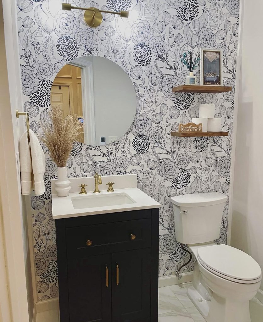 This powder room confidently embraces pattern with black-and-white floral wallpaper that transforms the walls into a striking art piece. Paired with a dark vanity and brass fixtures, the design feels bright, youthful, and renter-friendly—ideal for small apartments. The fusion of traditional floral motifs with contemporary graphics offers a sophisticated statement, complemented by open shelving adorned with natural accents for organic charm.