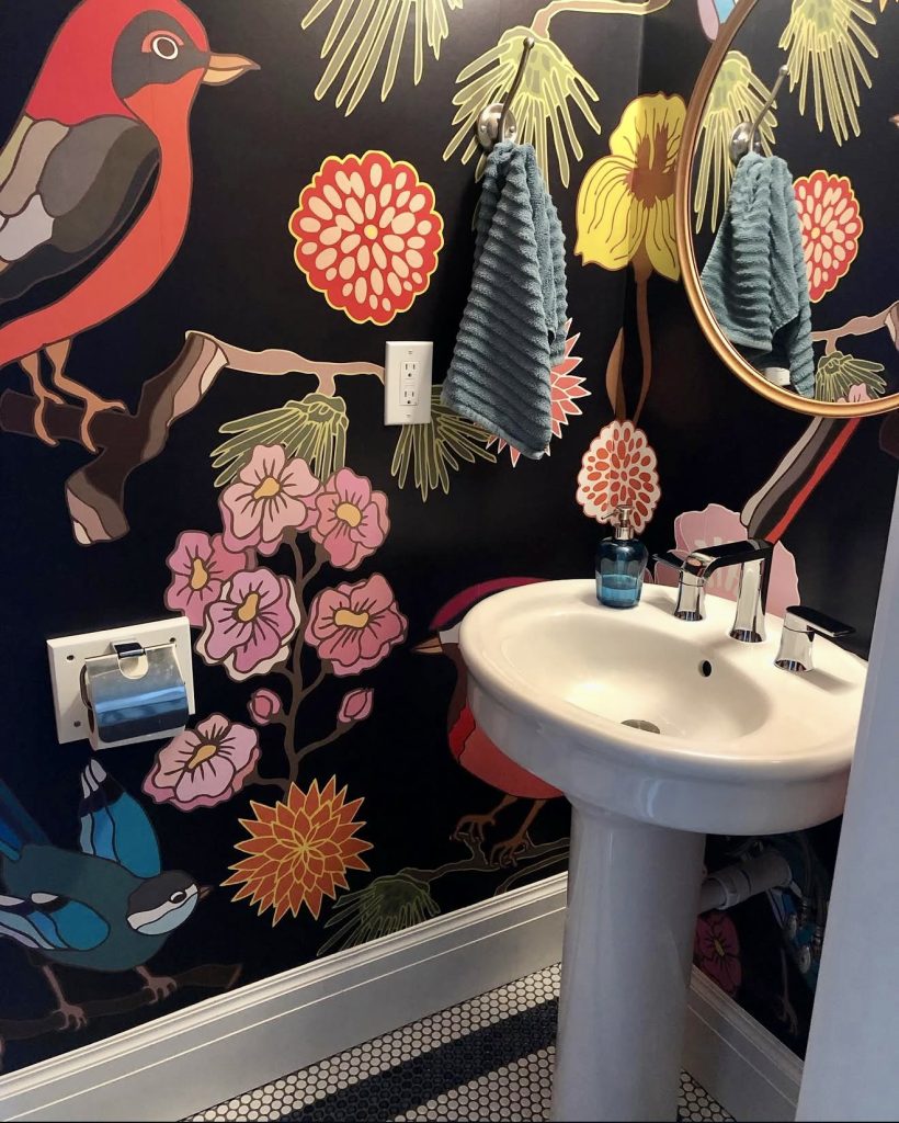 Unapologetically bold and creative, this half bath features dark floral and bird wallpaper that anchors the room in dramatic elegance. A crisp pedestal sink and brass accents provide balance, while the contrast between black and muted tones creates a sophisticated ambiance perfect for guest powder rooms. This design exemplifies how small spaces can deliver unforgettable style and personality.