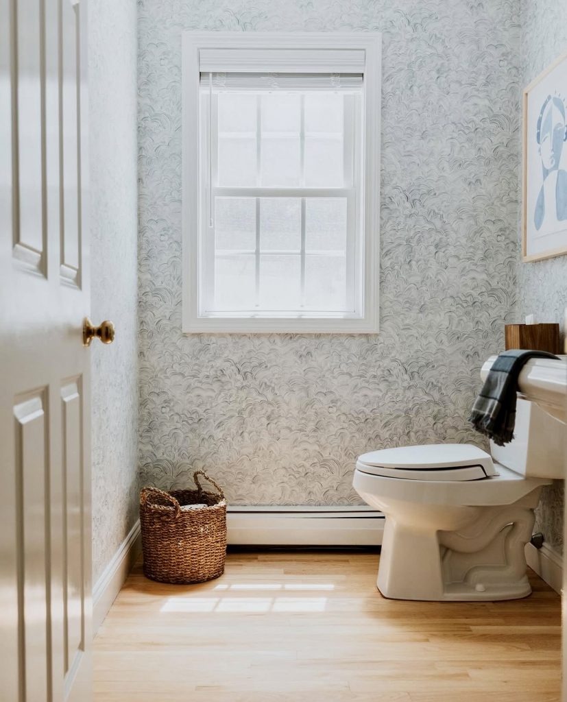 Filled with natural light, this narrow powder room embraces neutral tones and understated elegance. Feather-patterned wallpaper and natural wood flooring create a tranquil environment, while soft daylight enhances textures, making the space feel larger. A woven basket adds a practical, renter-friendly touch, keeping the design relaxed and effortless—ideal for those seeking calm and clarity in their home décor.