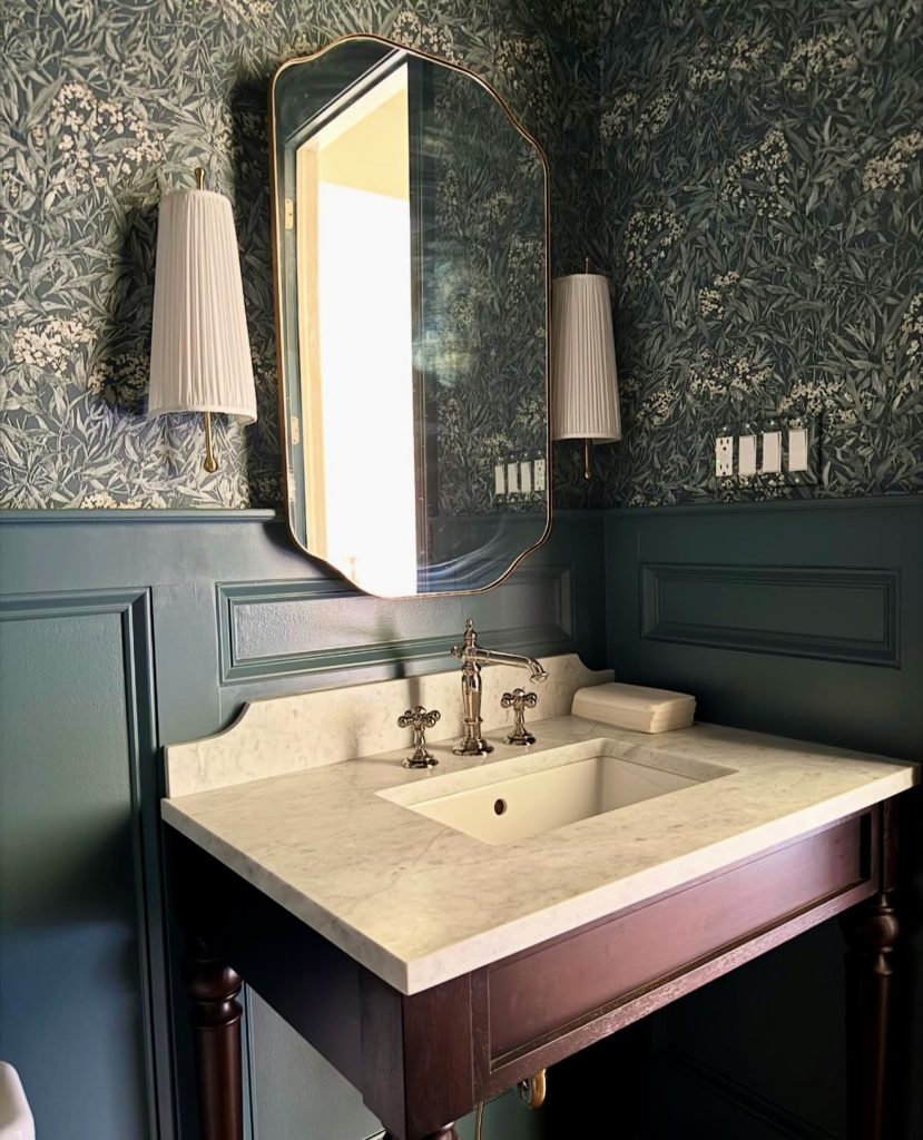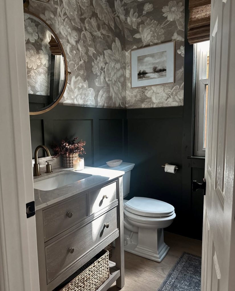 This intimate powder room uses dark floral wallpaper to create a romantic retreat. Deep green wainscoting grounds the space, while soft gray blooms add texture and femininity. Brass accents and a stone vanity unify the design with subtle luxury. This blend of traditional and modern elements suits farmhouse or apartment settings, reflecting a trend toward layered, elegant contrasts that balance coziness with drama.