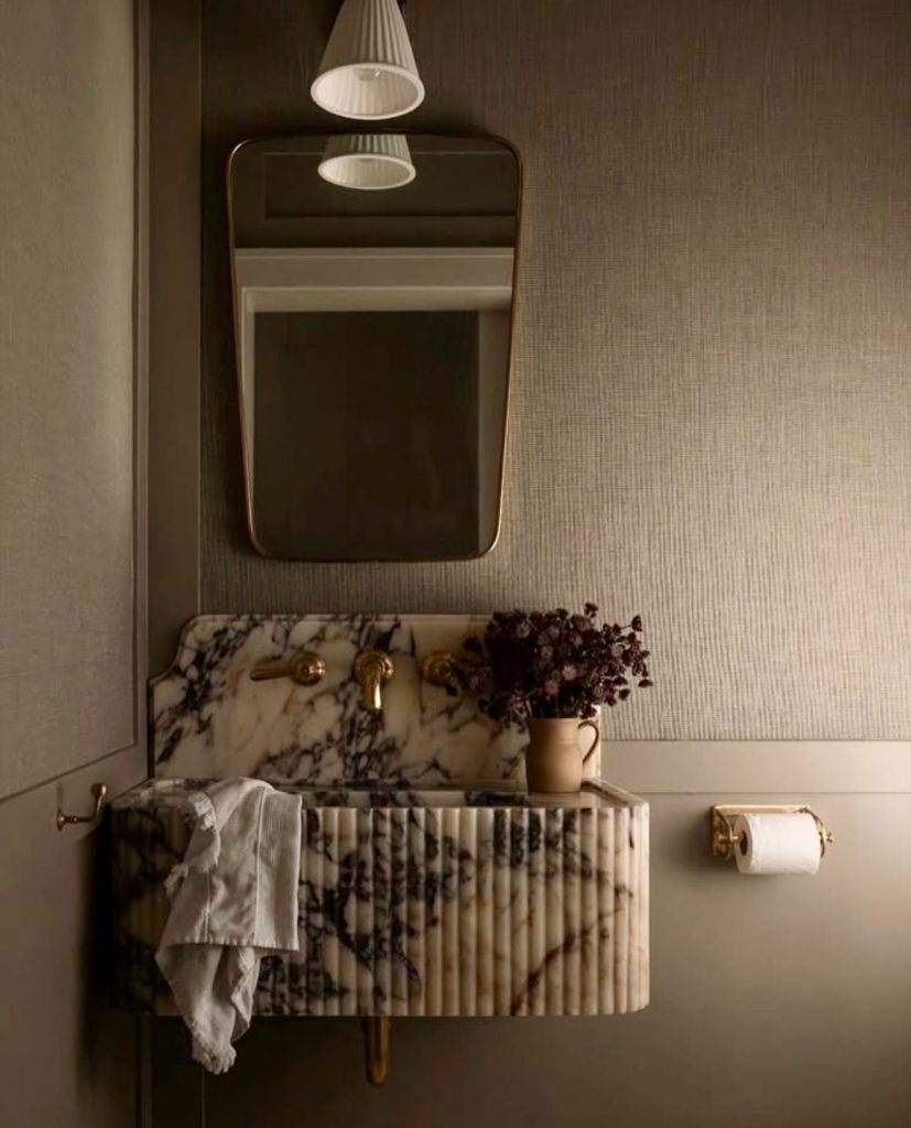 Exuding understated elegance, this half bath features a ribbed marble sink that serves as a sculptural centerpiece. Brass hardware adds warmth and balance, while textured wallpaper and soft lighting provide depth. This modern-traditional fusion proves that simplicity can be anything but plain. Ideal for narrow or compact spaces, the refined palette and tactile finishes create a sense of spaciousness and bespoke luxury on a budget.
