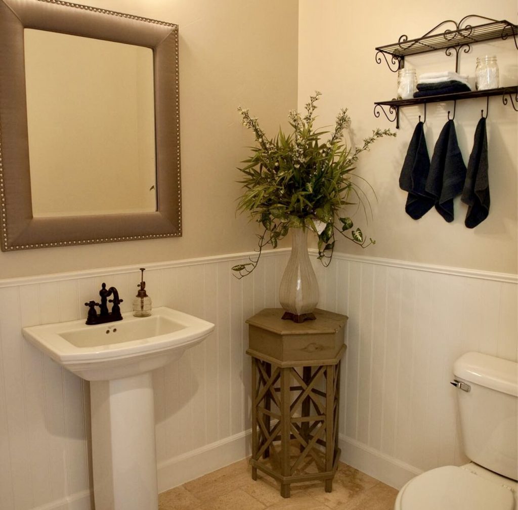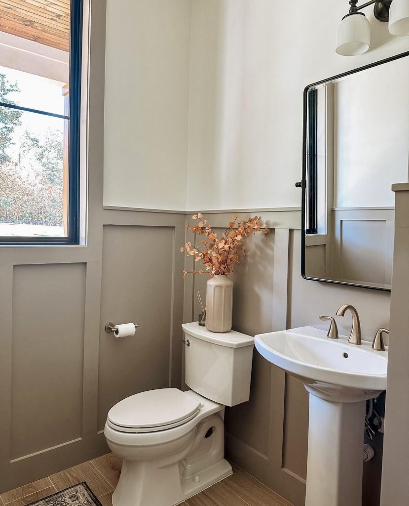 Featuring soft taupe walls and paneled wainscoting, this modern small guest bath feels grounded yet bright. A pedestal sink keeps the floor open, while bronze fixtures and dried florals add warmth and texture. This look exemplifies the growing trend toward neutral, intentional décor that is anything but plain. Perfect for compact or basement spaces, it blends traditional charm with minimalist sensibility for a calm, practical, and inviting atmosphere.