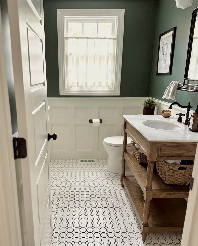 This green and white powder room strikes a perfect balance between freshness and tradition. Board-and-batten wainscoting anchors the lower walls, while a rich, moody green paint adds depth and sophistication. Warm wood tones in the vanity introduce farmhouse charm, and hexagonal floor tiles keep the look classic. This design feels spacious and inviting, ideal for small homes or basement baths, embodying a timeless yet grounded aesthetic.