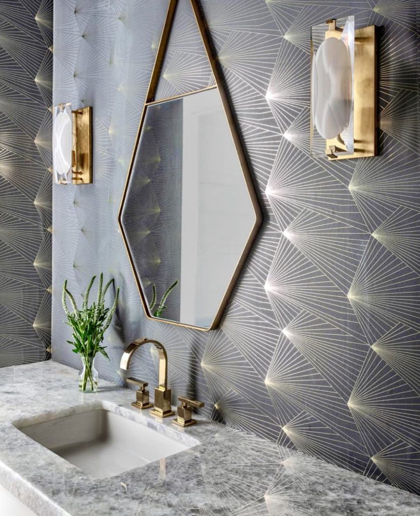 Metallic geometry takes center stage in this glamorous half bath. Patterned wallpaper channels subtle Art Deco vibes, enhanced by brass fixtures and a faceted mirror that reflects light beautifully. A marble countertop adds softness, while gold hardware elevates functionality into art. This bold yet refined look transforms any small powder room into a boutique-style jewel box, perfect for apartment living or budget-conscious homeowners seeking unique sophistication.