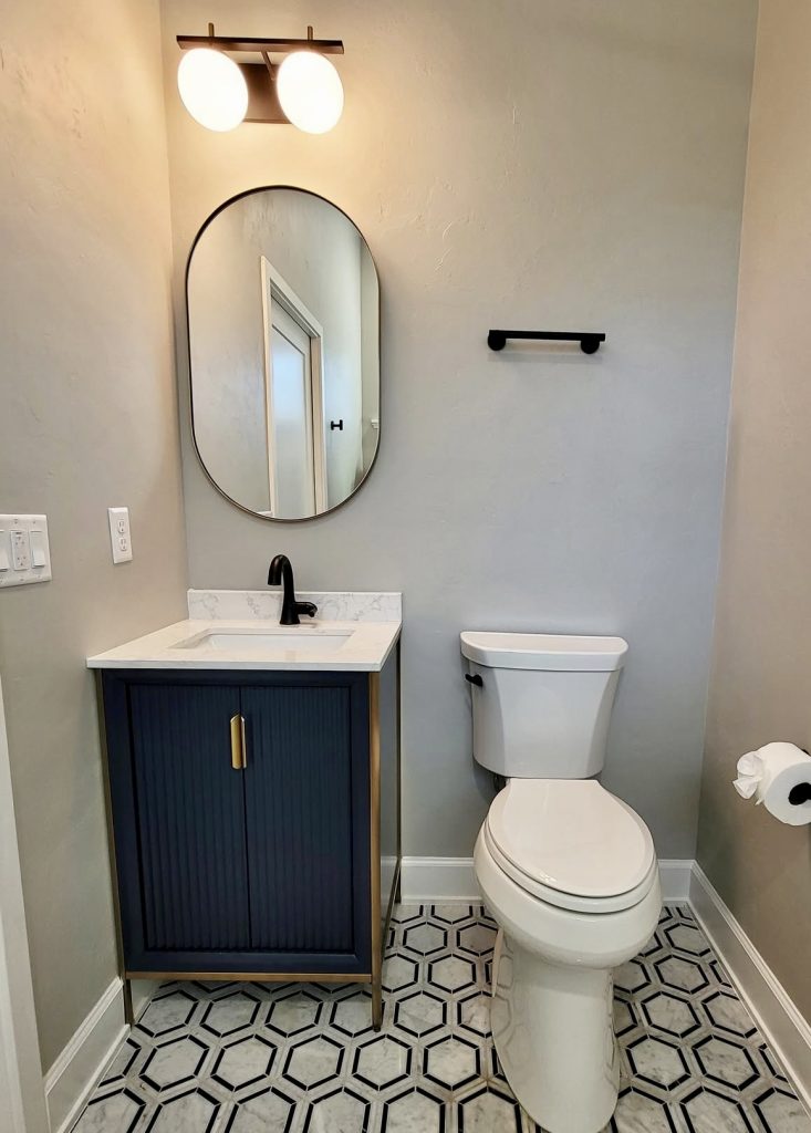 This compact half bath blends simplicity with style through geometric floor tiles and a navy vanity that adds a confident splash of color. Black hardware and lighting fixtures ground the design, making it renter-friendly yet polished. Perfect for narrow or small spaces, this look demonstrates how intentional décor choices can create a balanced, memorable bathroom that feels both clean and inviting.