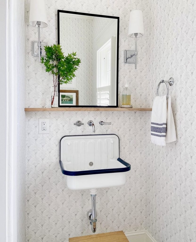 Radiating calm and charm, this coastal-inspired half bath features white patterned wallpaper that adds breezy texture. A slim sink and wooden shelf provide functional elegance for small or apartment layouts. Chrome fixtures and linen-white lighting keep the space fresh and neutral, while a small green branch introduces a natural touch. This renter-friendly design embodies timeless farmhouse minimalism with effortless appeal.