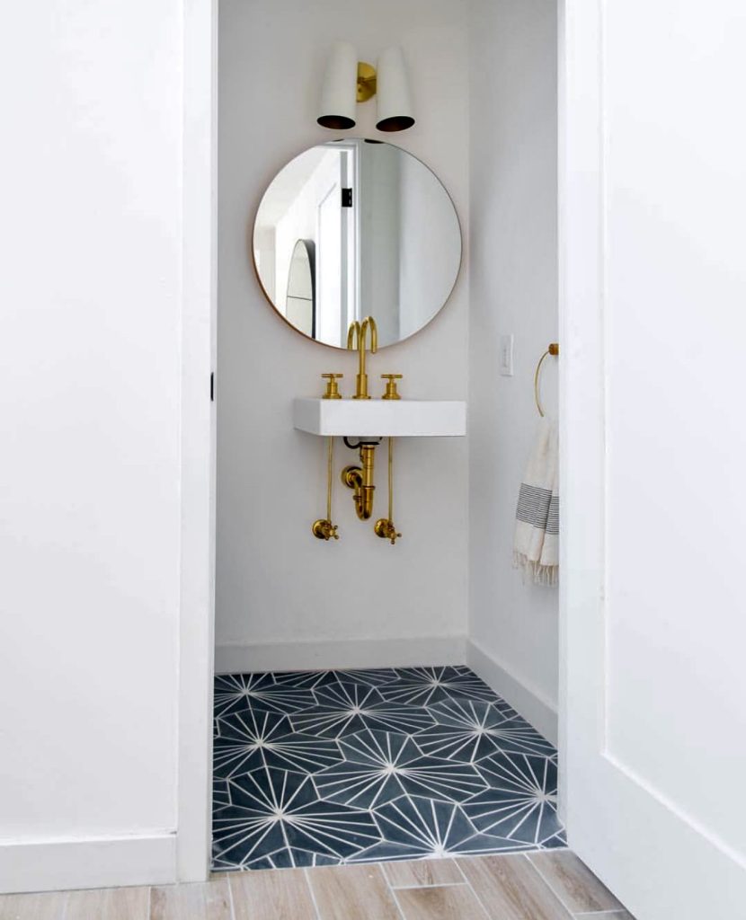 Proving that less is more, this tiny half bath features a floating sink that maximizes space, complemented by gold hardware and lighting that add subtle sophistication. Geometric floor tiles inject personality and modern playfulness. This clean, chic design is perfect for narrow layouts and small city apartments, combining minimalist principles with luxurious touches for a timeless yet fresh look.