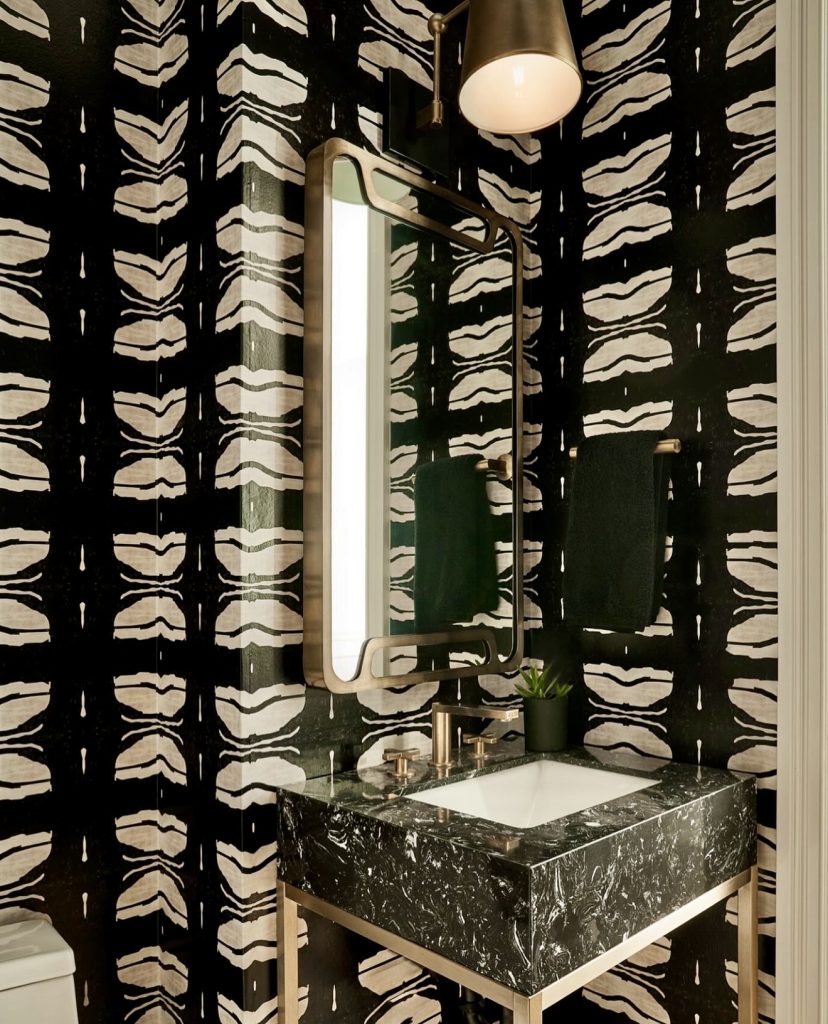 This eye-catching half bath features bold black-and-ivory abstract wallpaper that adds dynamic movement and depth. A sleek marble vanity introduces luxury, while gold accents soften the high-contrast palette, maintaining elegance without overwhelming the space. Ideal for small homes or apartments, this daring design embodies modern moody aesthetics—dramatic, artistic, and effortlessly stylish.