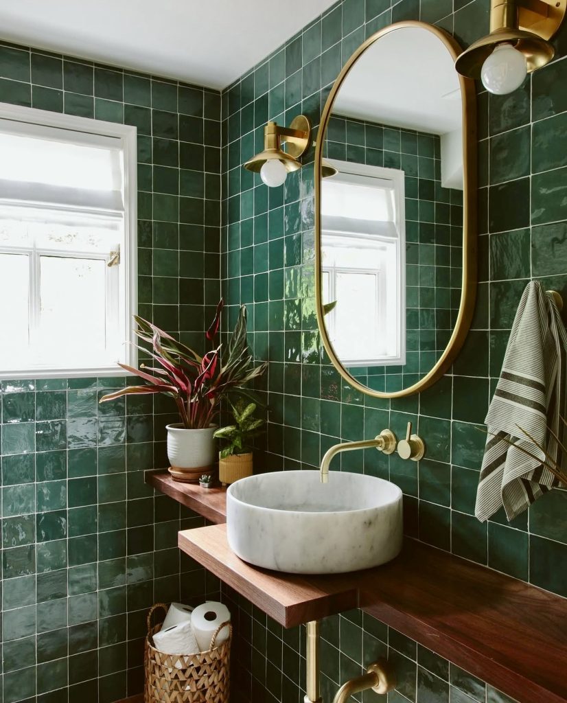 Celebrating the calming power of nature, this half bath features glossy green tiles paired with warm wood textures. Open shelving and a marble vessel sink create an organic, fresh feel, while brass lighting adds a touch of modern warmth. Suitable for coastal, farmhouse, or boho interiors, this design captures the essence of earthy luxury—serene, inviting, and timeless.