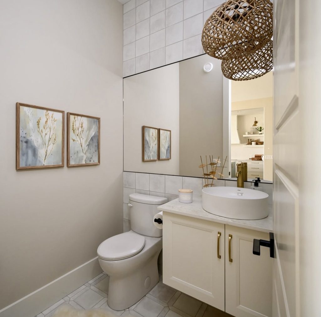 This cozy, light-filled half bath strikes a perfect boho balance. Woven pendant lights add texture and depth, while a simple floating vanity keeps the space airy. Neutral tones, subtle artwork, and organic materials define the look—effortlessly modern yet timeless. This renter-friendly design creates a softly luxurious retreat that embodies relaxed sophistication and thoughtful style.