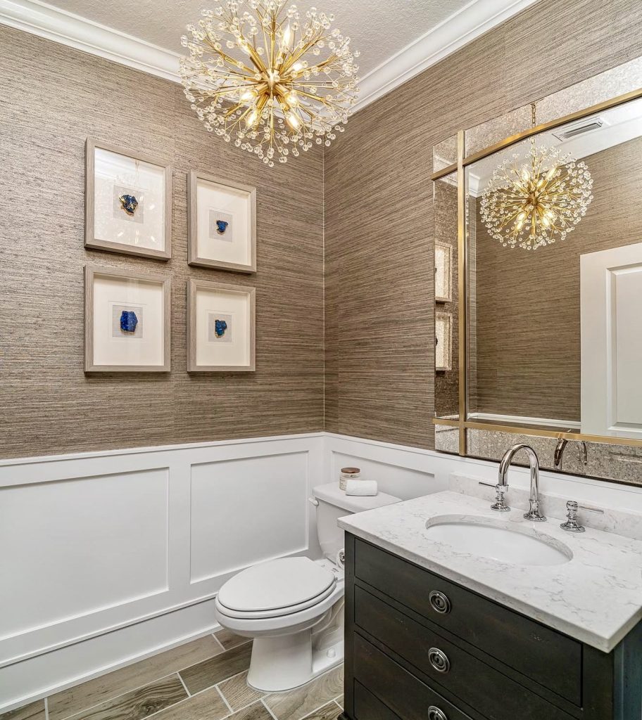 This refined powder room showcases how tactile elements can rival color in making a statement. The use of grasscloth wallpaper introduces a cozy yet sophisticated texture, harmonizing beautifully with pristine white wainscoting and a marble countertop accented by gleaming chrome fixtures. A modern crystal chandelier adds a touch of sparkle, while geometric artwork above the pedestal sink maintains a polished balance. This design is perfect for guest bathrooms seeking a luxurious yet inviting atmosphere, blending classic charm with contemporary freshness.